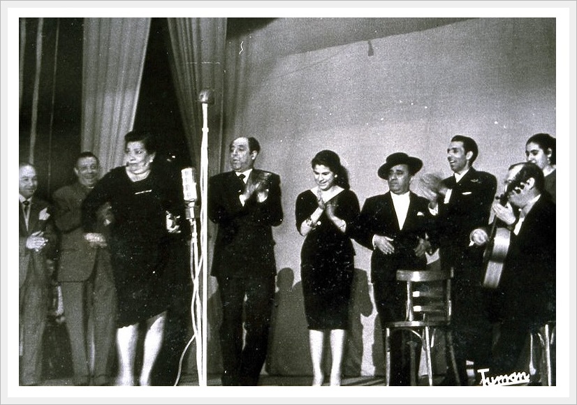 Nota: No se dice nada al respecto pero estoy seguro que la cantaora de justo a lado de Mairena es una joven Paquera de Jerez y la de lado del guitarrista bien pudiera ser La Perla de Cádiz.