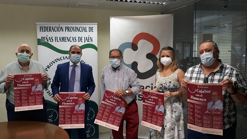 Jaén 2. jul. 2020.- El director de zona de Cajasur Jaén oeste, Juan Bergillos, acompañado por Susana Banqueri, del área de Instituciones de Cajasur en la provincia, y el presidente de la Federación Provincial de Peñas Flamencas, Francisco Viedma, han presentado el 9º Circuito Flamenco “Cajasur con el Flamenco” que en esta edición llevará 16 espectáculos flamencos a las peñas flamencas de la provincia de Jaén.