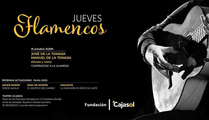 Con un cartel más corto de lo habitual por motivo de la alerta sanitaria, la primera actuación dentro de este ciclo estará a cargo de una saga familiar de artistas: José de la Tomasa y Manuel de la Tomasa (abuelo y nieto), que presentan su espectáculo ‘Cantándole a la Alameda’. El concierto tendrá lugar el próximo jueves, 15 de octubre a las 21.00 horas, en el Teatro Cajasol (C/Chicarreros, 1. Sevilla).