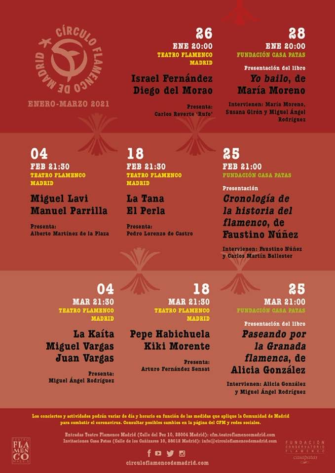 Para finalizar el trimestre, el mes de marzo lo iniciaremos con un concierto de La Kaíta, cantaora singular que vendrá escoltada por las guitarras de Miguel y Juan Vargas. El día 18 la guitarra cobrará todo el protagonismo con la presencia de Pepe Habichuela, en uno de los conciertos más deseados por quienes integramos el CFM. Como colaboración especial al cante, le acompañará Kiki Morente. Este periodo lo cerraremos sin salirnos de tierras nazaríes con la presentación —el día 25— del reciente libro de Alicia González titulado «Paseando por la Granada flamenca». Los conciertos tendrán lugar en el Teatro Flamenco Madrid (Teatro Alfil).