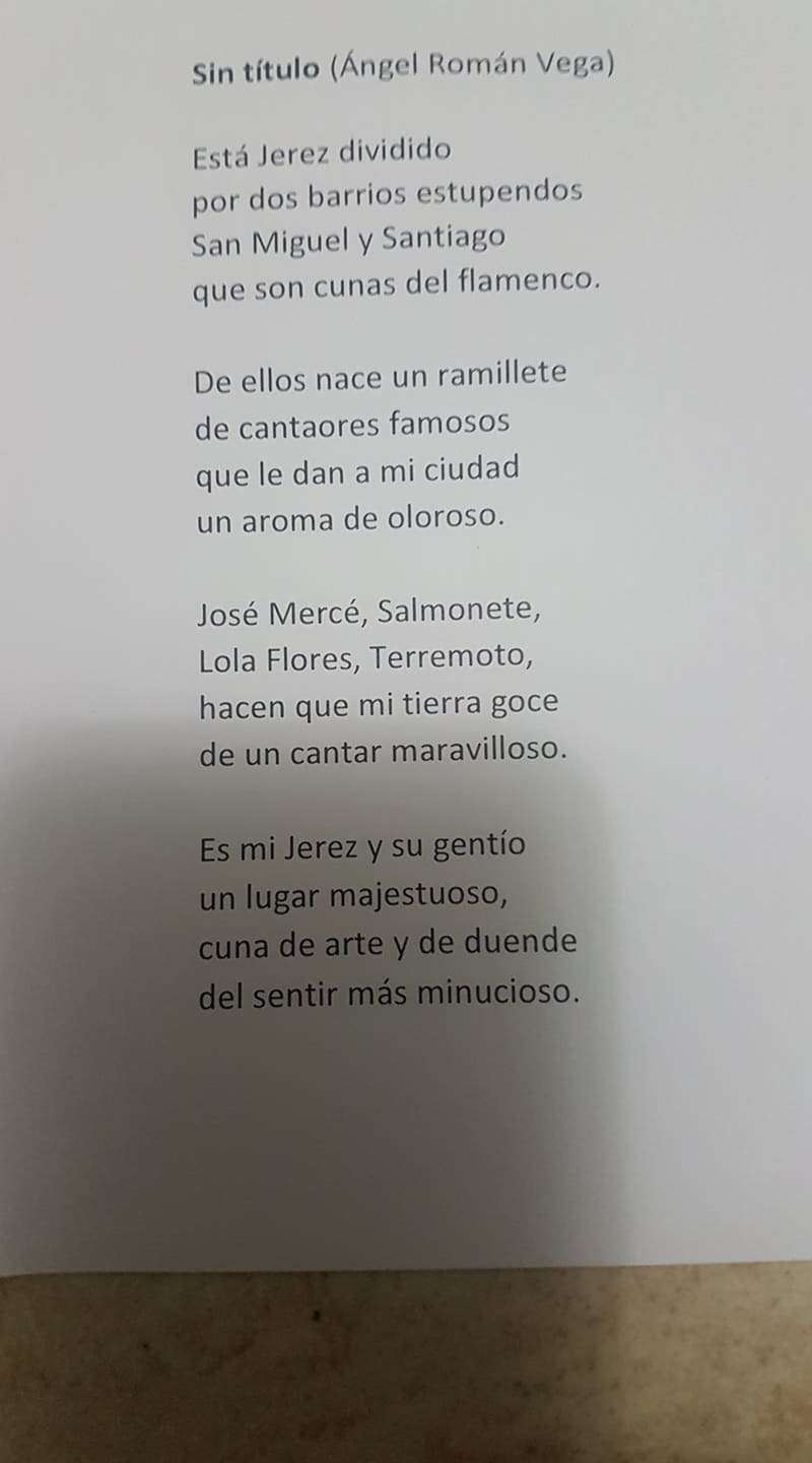 Reitero la gracias al profesor Miguel Ángel porque estos son gestos que realmente hacen que la ilusión por defender nuestra cultura no decaiga pese a las dificultades. Aquí os dejo el poema que contiene las letras ganadores de Ángel Román. Finalmente agradezco a todo el instituto de enseñanza secundaria (que bien pudiera tomar algún nombre relacionado con nuestro flamenco) y a los padres de Ángel, uno de los ganadores del certamen de letras flamencas IES «Nuevo» de Jerez, por permitir que publiquemos su fotografía.