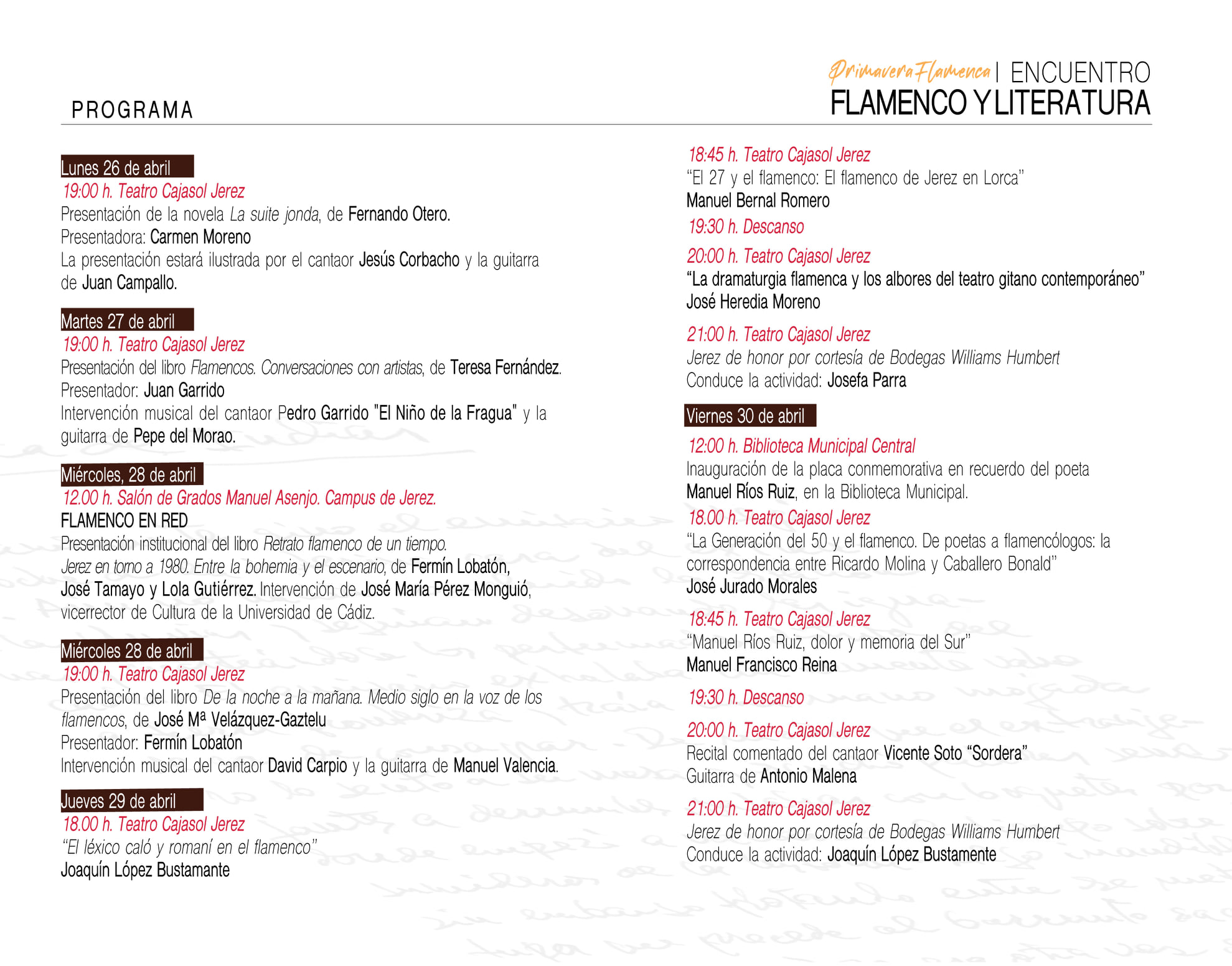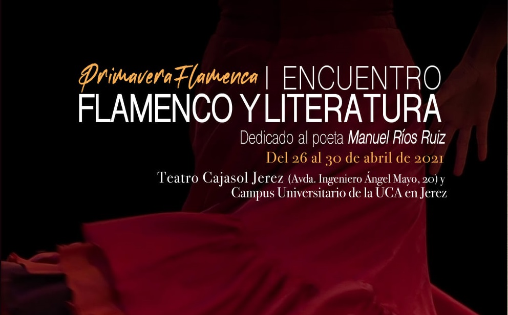 Flamenco en Red y el Servicio de Extensión Universitaria del Vicerrectorado de Cultura de la Universidad de Cádiz colaboran con el I Encuentro Flamenco y Literatura dedicado al poeta Manuel Ríos Ruiz, organizado por Ayuntamiento de Jerez, Fundación Caballero Bonald, Fundación Cajasol y Fundarte. Tendrá lugar del 26 al 30 de abril en Teatro Cajasol de Jerez y el Campus Universitario de la ciudad.