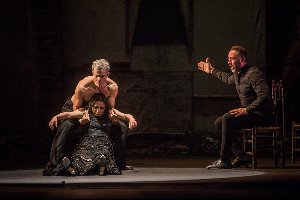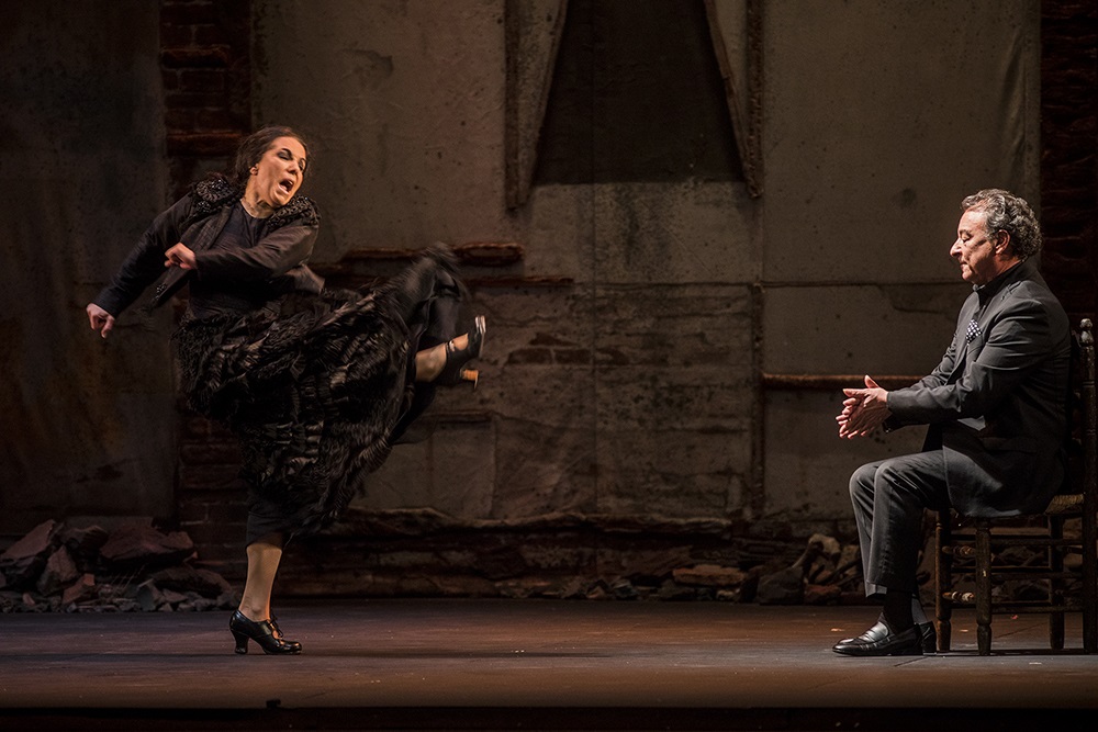 Este pasado jueves 6 de mayo, la compañía de la bailaora Eva Yerbabuena inauguró la XXV edición del Festival de Jerez con el espectáculo ‘Al igual que tú’. Una obra intimista y figurativa aderezada con estampas de su baile flamenco único e intransferible. (Foto: Javier Fergó / Festival de Jerez; Eva con Luis Moneo quien bordó la soleá y la bulería para escuchar)