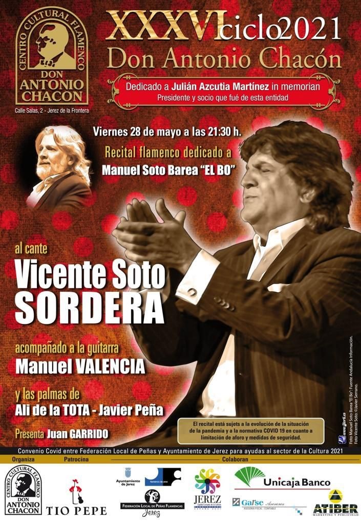 El próximo 28 de mayo, a las 21.30 horas, con motivo del XXXVI Ciclo Don Antonio Chacón, tendrá lugar el recital extraordinario del cantaor Vicente Soto ‘Sordera’. Estará acompañado a la guitarra por Manuel Valencia y las palmas de Ali de la Tota y Javi Peña. (El cartel es obra de Torti Cala)