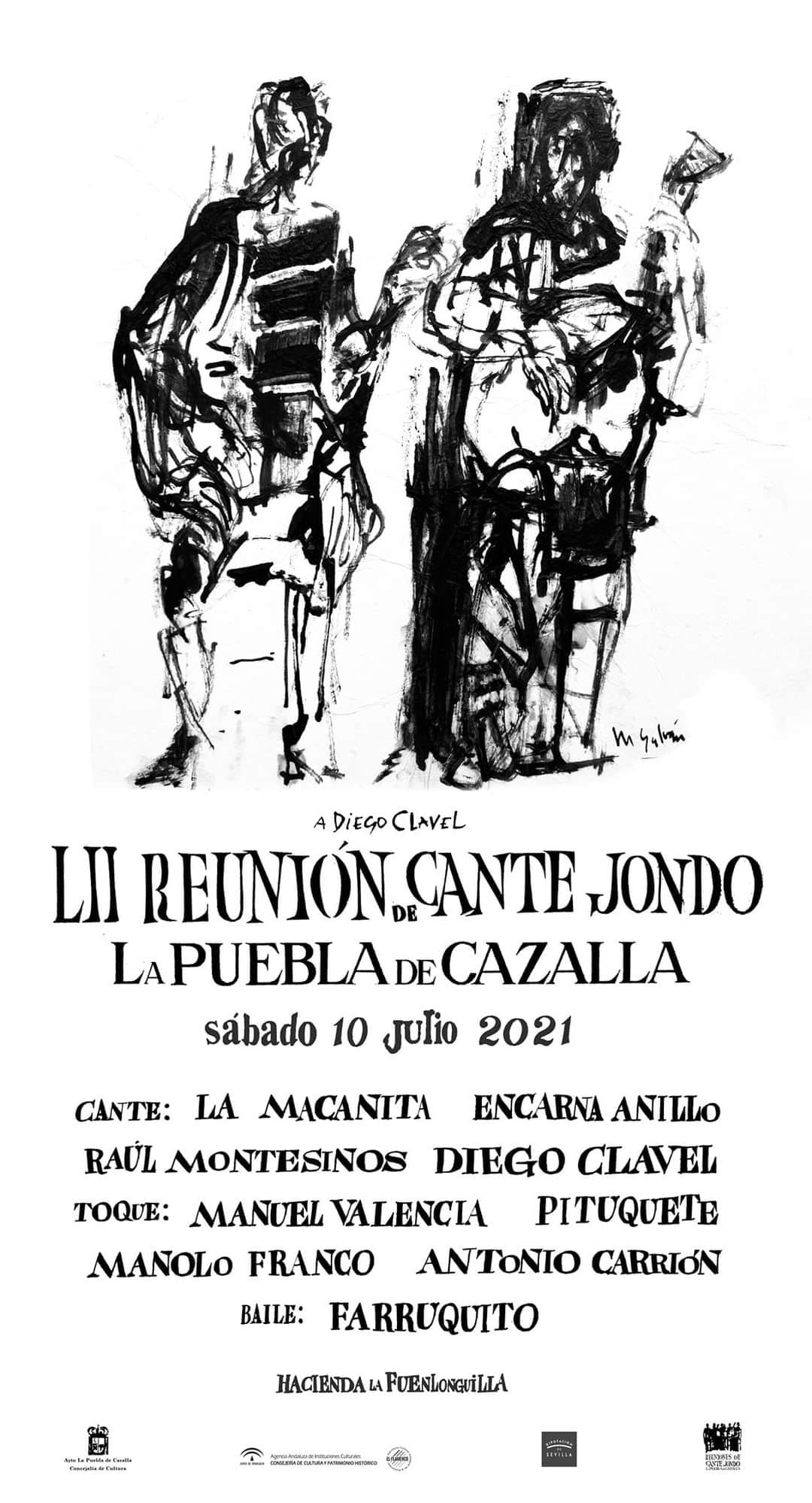 El prestigioso festival flamenco morisco está dedicado con toda justicia al cantaor Diego Clavel. Se celebrará en su tradicional ubicación de la Hacienda La Fuenlonguilla de la localidad sevillana con un extraordinario cartel. (El grabado del cartel es de Francisco Moreno Galván)