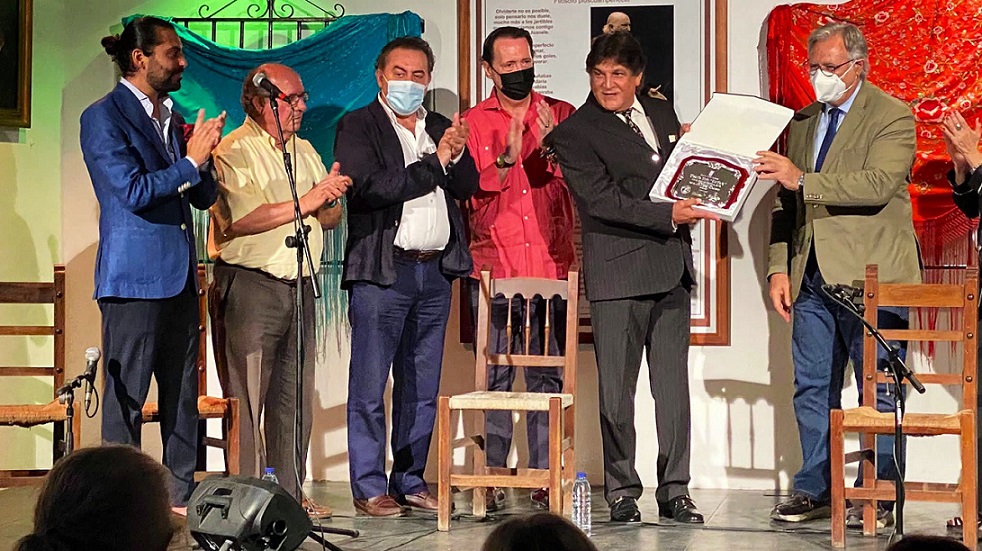 Durante el transcurso de un recital de Vicente Soto ‘Sordera’ en el Centro Cultural Flamenco Don Antonio Chacón, el cantaor de Santiago recibió el reconocimiento por parte de la Federación local de peñas flamencas de Jerez, como se comprueba en la foto de portada.