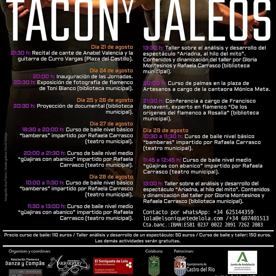 Del 21 al 29 de agosto próximos, la bella localidad cordobesa de Castro del Río va a celebrar la cuarta edición de su ciclo formativo y de espectáculos con el nombre de Tacón y Jaleos. Este año con el protagonismo de la gran bailaora y coreógrafa Rafaela Carrasco con su obra ‘Ariadna del hilo al mito’ (Fotos de la cabecera: Ana Palma / Diseño: David Hidalgo)