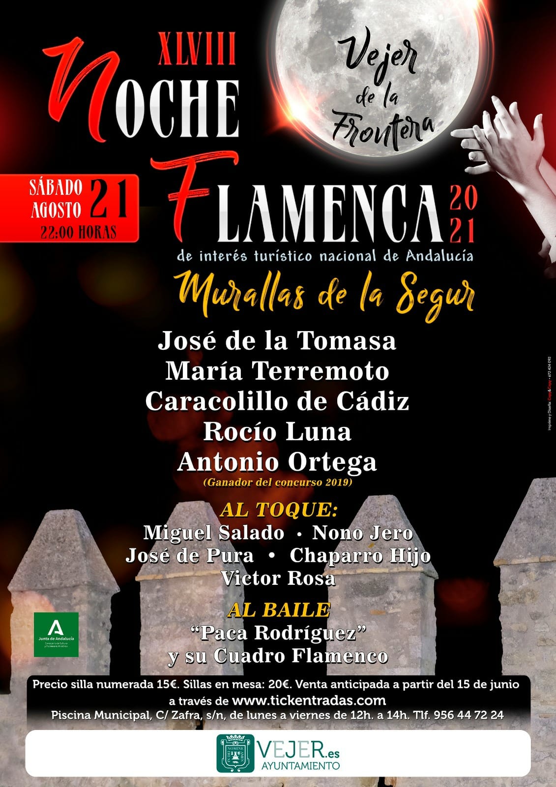 La 48ª edición de Las Noches Flamencas de Vejer en Murallas de la Segur de interés turístico nacional de Andalucía comenzará a las 22.00 horas y contará con artistas de la talla de José de Tomasa, María Terremoto, Caracolillo de Cádiz, Rocío Luna y Antonio Ortega quienes estarán acompañados por la guitarras de Nono Jero, José de Pura, Chaparro hijo, Paco León y Víctor Rosa. Como broche final el baile de la artista vejeriega, Paca Rodríguez, gran bailaora que cosecha grandes éxitos en los tablaos flamencos de Madrid.