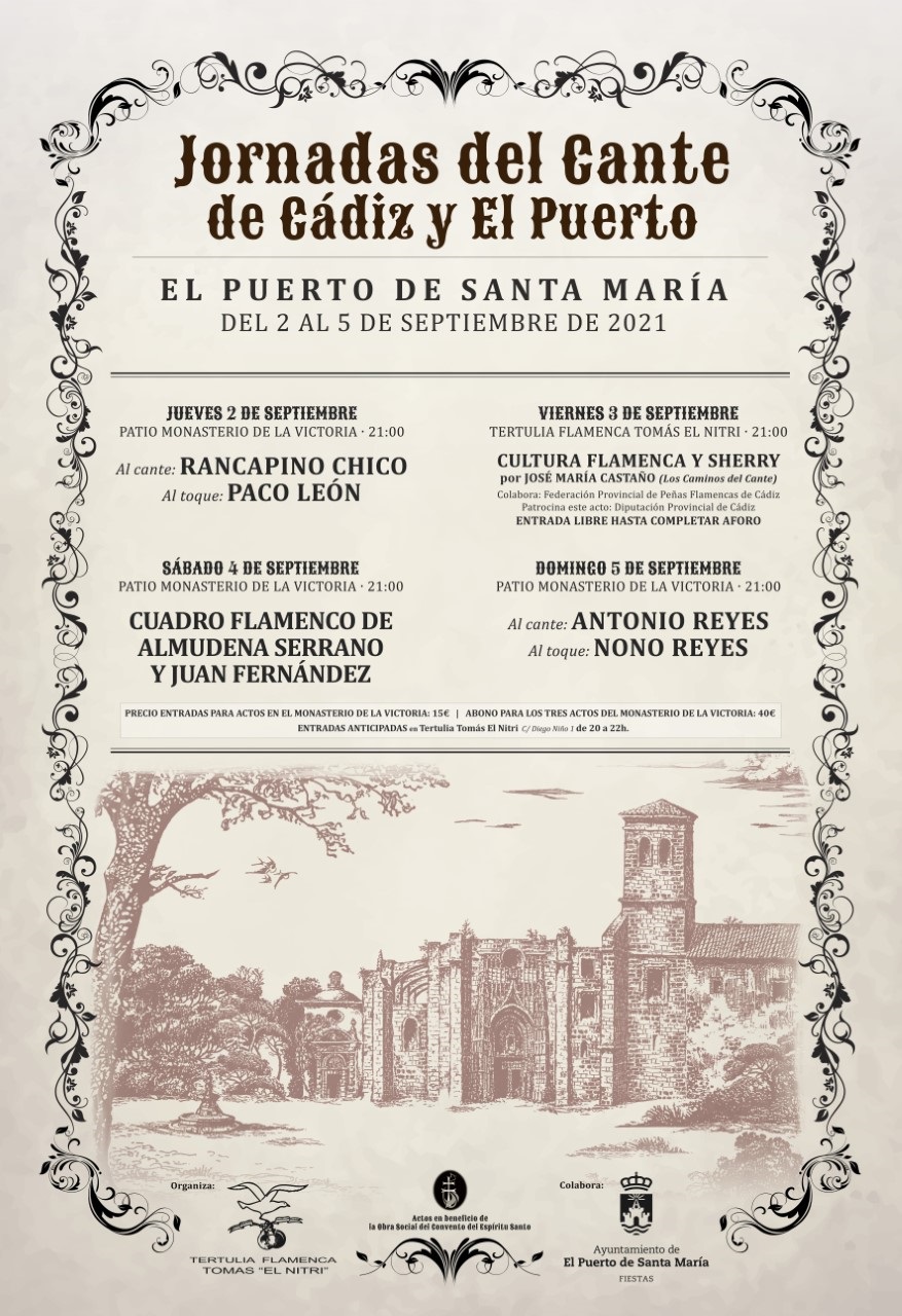 Organiza: Tertulia Flamenca Tomás “El Nitri”. Actos en beneficio de la Obra Social del Convento del Espíritu Santo. Colabora: Concejalía de Fiestas del Ayuntamiento de El Puerto de Santa María.