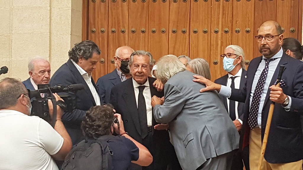«Emocionante entrega de la por parte de la directiva de la peña Tío José de Paula, al último mohicano, al último de la edad del oro del cante jondo, al guitarrista Manuel Morao en Valdespino Bodega Real Tesoro llena de artistas y aficionados a este mundo. Y emocionante por muchas cosas, por la buena pinta de tío Manuel, por su talante, por su fenomenal cabeza, y sobre todo porque quien sino él, del orbe de lo flamenco se merece éste y todos los reconocimientos, él, que no solo hizo su carrera, sino que impulsó a otros a perpetuar el clasicismo de este arte. Una razón incorpórea callada pero que ahí está …/… Pero para la entrega de la insignia quedaba una sorpresa, otro jerezano ilustre, el torero Rafael de Paula asiste al evento y a petición del presidente de la Peña, Joaquín el Zambo, hace los honores de condecorar a Tío Manuel Morao».
