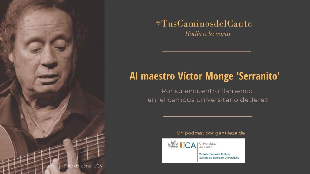 Con motivo del encuentro flamenco que va a tener lugar este jueves 20 de enero en el campus universitario de Jerez, el Servicio de Actividades Culturales y Extensión Universitaria de la Universidad de Cádiz tiene la gentileza de compartir este pódcast en homenaje a todo un referente histórico de la guitarra flamenca: Víctor Monge Serranito. (Foto: del cartel anunciador del evento)