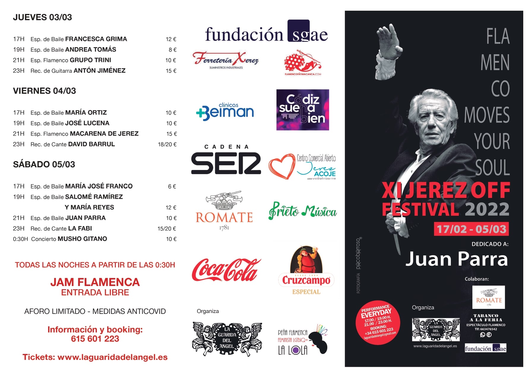 Aquí podéis consultar toda la programación con horarios y precios del Off Festival de Jerez, en esta ocasión dedicado al maestro Juan Parra: