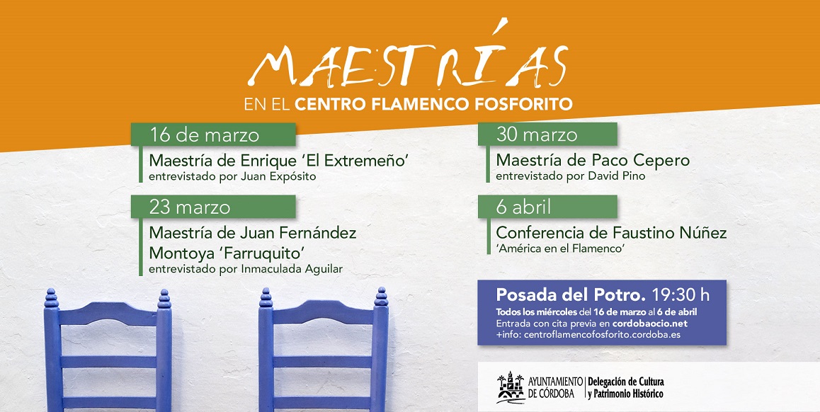 La programación de Maestrías se desarrollará los miércoles, a las 19:30 horas, desde el 16 de marzo al 6 de abril. Así, tras la charla coloquio con el cantaor Enrique ‘El Extremeño’ de esta semana, se sucederán los encuentros con el bailaor sevillano Juan Fernández Montoya ‘Farruquito’, el 23 de marzo; el veterano guitarrista jerezano Paco Cepero, el 30 de marzo; y el musicólogo Faustino Núñez, que será el encargado de clausurar el ciclo con su conferencia ‘América en el Flamenco’.