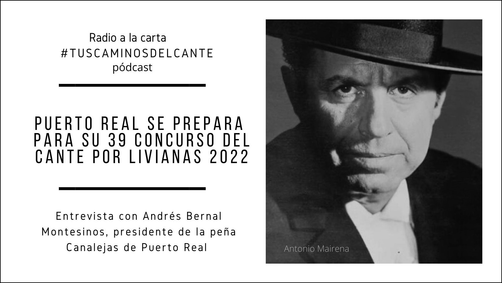 La peña flamenca Canalejas de Puerto Real ha anunciado la trigésimo novena edición del concurso nacional del cante por Livianas. Un ensolerado certamen por el que han pasado importantes intérpretes de este estilo y que se celebrará este año entre el 29 de abril y el 16 de julio 2022. (En portada, Antonio Mairena quien … Continuar leyendo Puerto Real prepara su 39 Concurso de cante por Livianas 2022 (pódcast)