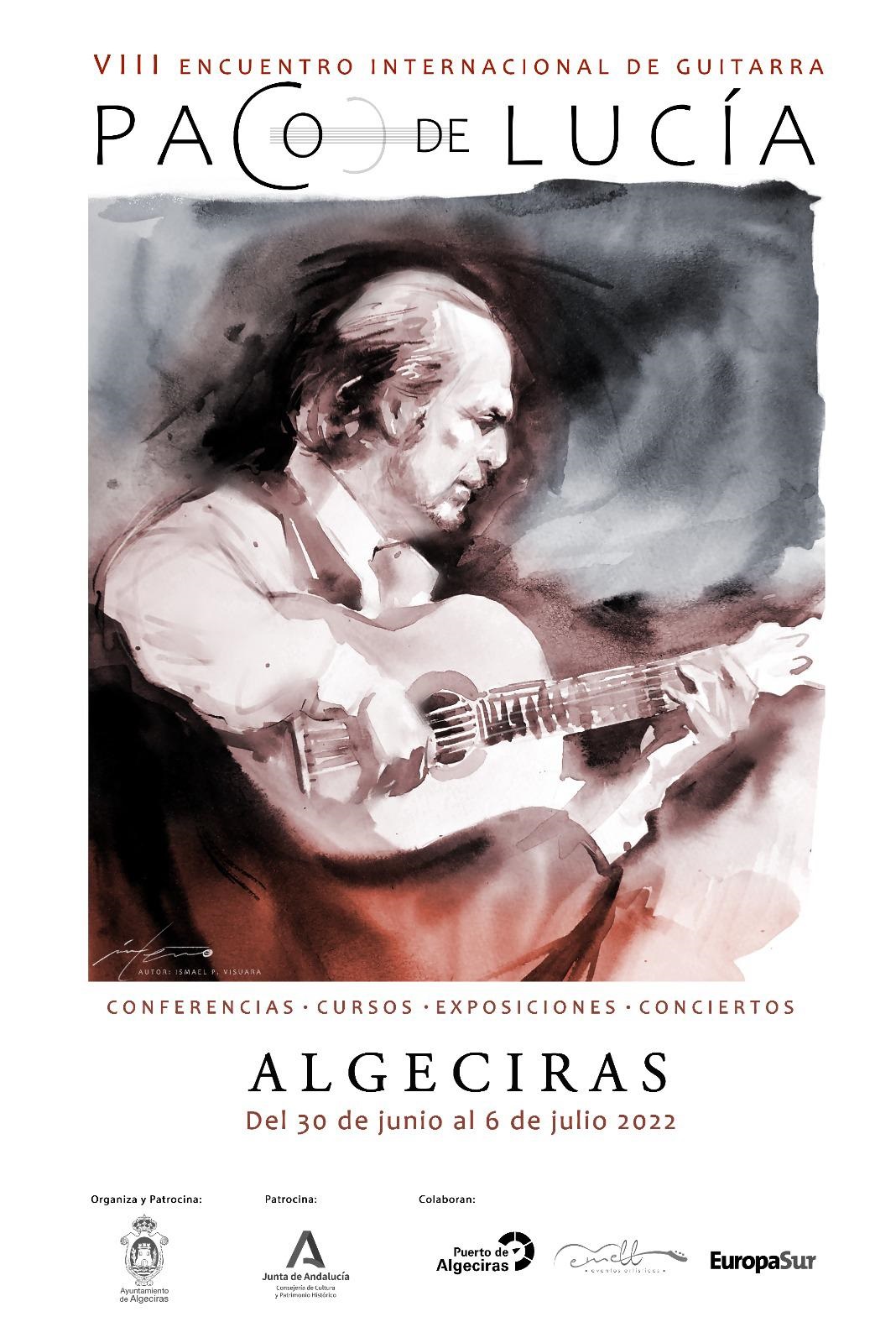 Fiel a su cita y volviendo a la ansiada normalidad, el amigo, promotor y empresario José Luis Lara de Algeciras nos comunica el programa de actuaciones que habrán de componer el VII Encuentro Internacional de Guitarra dedicado al genio de Algeciras, Paco de Lucía. (Detalle del grabado que se incluye en el cartel anunciador obra de Ismael P. Visuara)