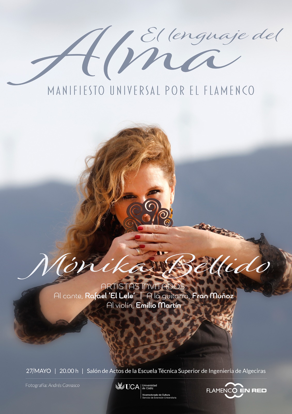 Se trata de un espectáculo didáctico-interactivo sobre baile flamenco que la bailaora Mónika Bellido pondrá en escena el próximo viernes 27 de mayo a las 20.00 horas en el Salón de Actos de la Escuela Politécnica de Algeciras. Una actividad dentro de ‘Flamenco en red’, en el marco del Proyecto Atalaya de la Junta de Andalucía. (Detalle del cartel anunciador con fotografía de Andrés Carrasco)
