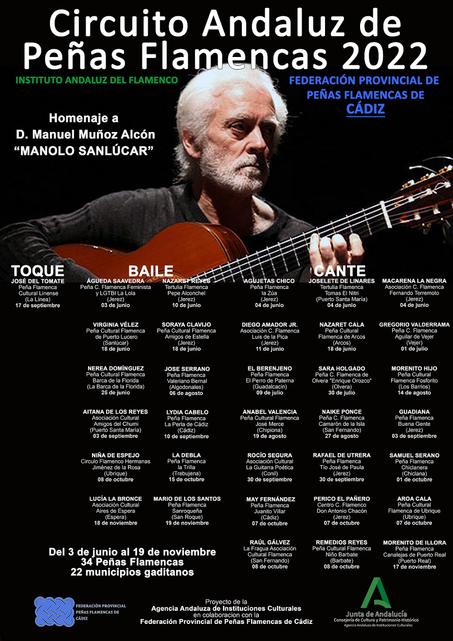 La Federación Provincial de Peñas Flamencas de Cádiz, presenta su “Circuito Andaluz de Peñas Flamencas de Cádiz 2022”, que arrancará el próximo viernes día 03 de junio de 2022, en la Peña Cultura Flamenca Feminista y LGTBI La Lola de Jerez de la Frontera, con el baile de Águeda Saavedra y finalizará el día 19 de noviembre de 2022 en la Peña Flamenca Sanroqueña con el baile de Mario de los Santos. (En portada, foto que se incluye en el cartel anunciador)