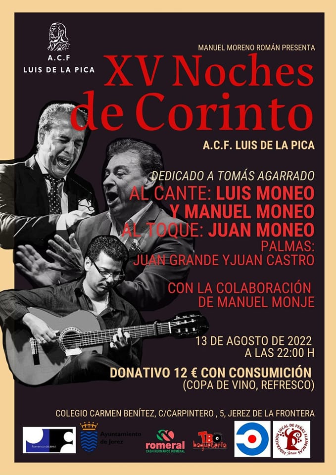 Este próximo sábado 13 de agosto, en la sede de la Asociación Cultural Flamenca Luis de la Pica del barrio de Santiago, se celebrarán la XV edición de las Noches de Corinto que organiza la entidad de la calle Carpinteros. Luis Moneo con sus hijos Manuel y Juan Manuel centran un cartel que tendrá a Manuel Monje como artista invitado. (La foto es de Claudia Ruiz)
