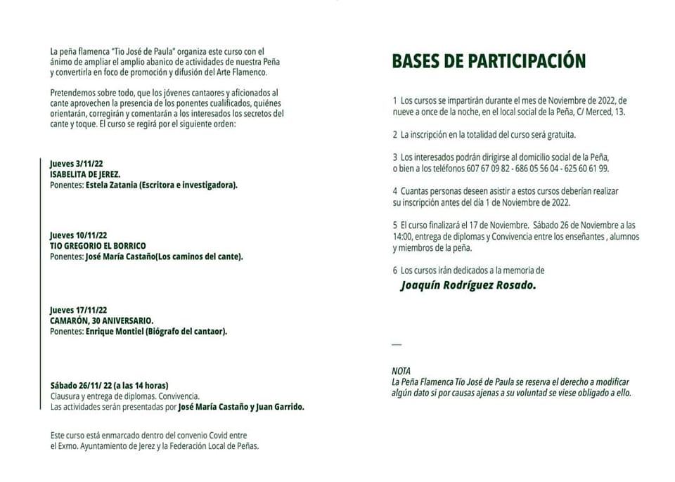 Al frente de la parte práctica estarán el cantaor Joaquín el Zambo y la guitarra de Antonio Higuero. En el díptico, que acompaño más abajo, están todos los detalles de la convocatoria docente, así como la forma de inscribirse para participar en este interesante curso flamenco.