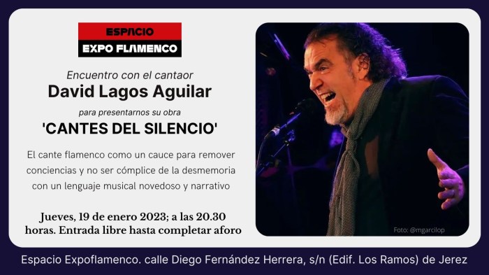 “Cantes del silencio”, es la cuarta obra de David Lagos en solitario. Que no solo es discográfica, sino también escénica. Y tiene el sentido del compromiso como premisa, tanto en la forma, como en el fondo. En este espectáculo, experimenta con un nuevo lenguaje musical, sonoro y expresivo a partir de las formas tradicionales del cante, que tan hondamente conoce y respeta. Pero esta vez lo elabora sobre un trasfondo narrativo.
