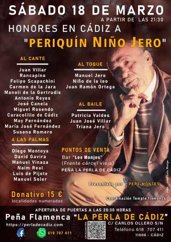 El próximo 18 de marzo, en la peña flamenca La Perla de Cádiz y a partir de las 21.30 horas, se reunirá un extraordinario elenco de artistas con el fin de rendir honores al guitarrista jerezano Pedro Carrasco ‘Niño Jero’. Que la coordinación del evento esté a cargo Juan Carlos de El Templo Flamenco es, sin duda, toda una garantía de éxito. (Niño Jero por Juan Luis Monge, de quien es también la foto del cartel anunciador)