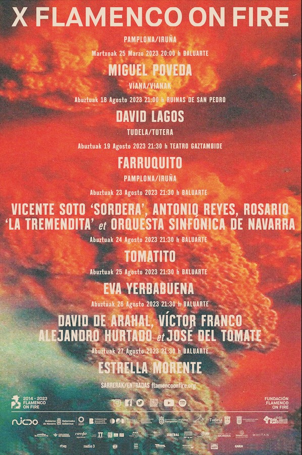 El resto de ‘Grandes Conciertos’ se desarrollarán en Viana, Tudela y Pamplona en agosto. David Lagos abrirá las puertas de las Ruinas de San Pedro de Viana con Clásico personal el día 18 a las 21 horas. Farruquito, las del Teatro Gaztambide de Tudela con Bajañí el 19 a las 21.30. Tras ellos, el miércoles 23 de agosto tendrá lugar una producción propia de Flamenco On Fire en el Auditorio Baluarte: Una historia del cantaor flamenco, con Vicente Soto Sordera, Antonio Reyes, La Tremendita, la Orquesta Sinfónica de Navarra y otros artistas invitados adentrándose en el universo de Manolo Caracol 50 años después de su muerte. En ese mismo espacio y también a las 21.30 horas estará Tomatito con Viviré el jueves 24; Eva Yerbabuena y Juan Kruz con Re-fracción (desde mis ojos), el 25; otra producción propia del festival, Alzapúa, que une por primera vez a los jóvenes guitarristas Alejandro Hurtado, David de Arahal, José del Tomate y Víctor Franco bajo la dirección de Rycardo Moreno, el 26; y, finalmente, el espectáculo Desde la cuna, de Estrella Morente, el día 27 de agosto.