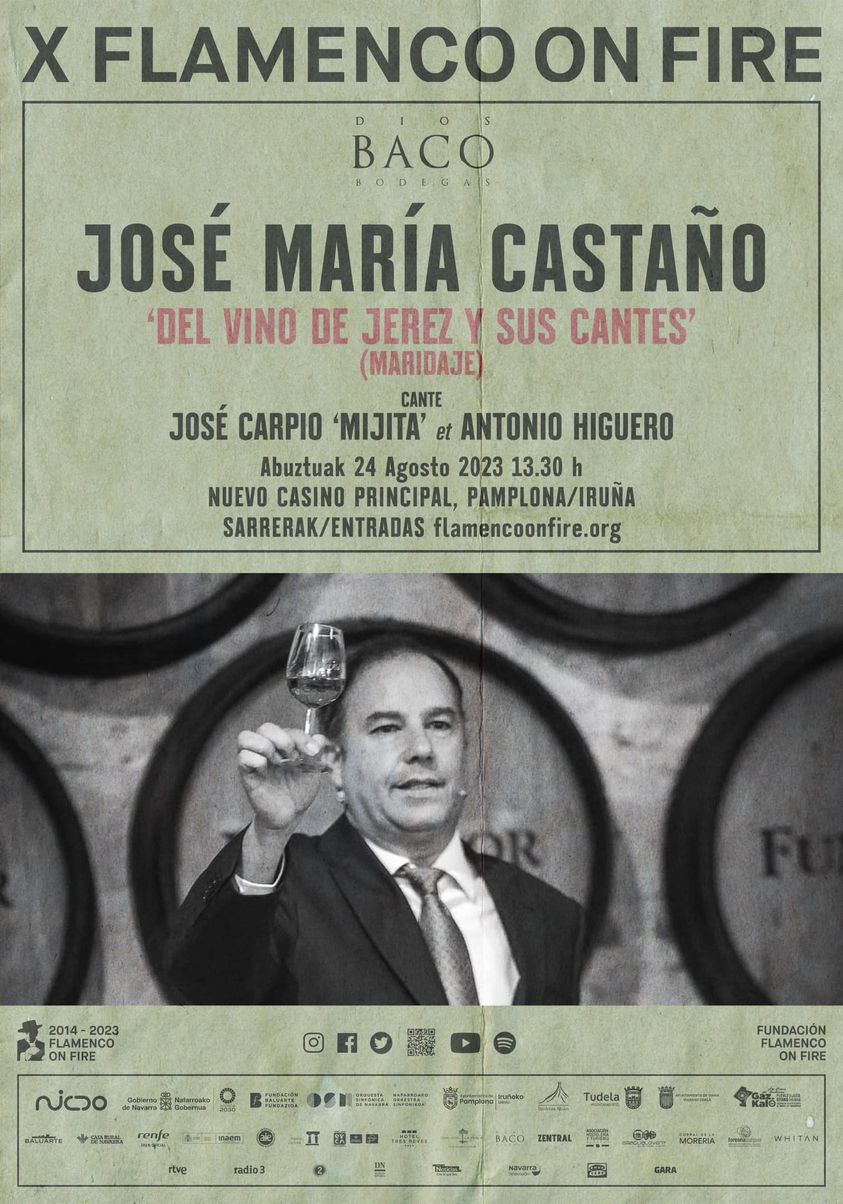 En anterior entrada, comentábamos a la familia de caminantes que nos llena de ilusión participar con nuestra experiencia de vinos y cantes de Jerez en el décimo aniversario del Flamenco On Fire de Pamplona. Junto a José Mijita, al cante, y Antonio Higuero, a la guitarra, se suma La Bodega Dios Baco a la embajada jerezana en el Nuevo Casino Principal de la capital navarra. (En portada, las fotos de José Mijita y Antonio Higuero son de Juan Luis Monge)