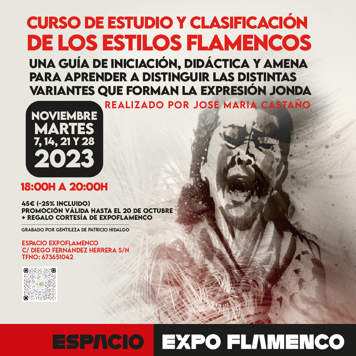 El curso se desarrollará durante cuatro martes (7, 14, 21 y 28) del mes de noviembre 2023, en horario de 18,00 a 20,00 horas (8 horas) en Espacio Expoflamenco de Jerez (Edificio Los Ramos de la calle Diego Fernández Herrera s/n, Tfno: 673651042) (google maps), y estará dirigido por José María Castaño @caminosdelcante y @expoflamenco.