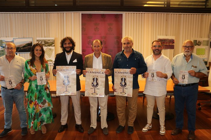 El alcalde de Chiclana, José María Román; el delegado de Fiestas, Fede Díaz; los representantes de la Peña Flamenca Chiclanera encabezados por su presidente, José Manuel González ‘Mané’; y los artistas chiclaneros Antonio Reyes (en la foto de portada por Paco Lobato) y Macarena Ramírez, han presentado el programa de actividades con motivo del 50 aniversario de la Peña, que se conmemora en este presente año 2023.
