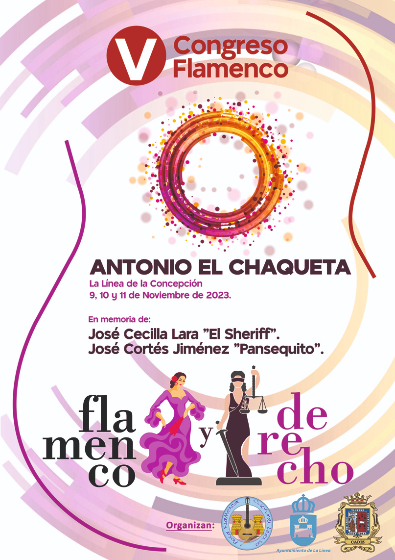 Siguiendo con este proceder pretendemos en este “V Congreso Flamenco Antonio El Chaqueta” acercarnos, desde una vertiente jurídica, a cuestiones que afectan al Flamenco: la defensa de la obra artística, sistemas de previsión social de los artistas flamencos, la relación de las Peñas Flamencas con las distintas Administraciones, la aplicación de las nuevas normas al quehacer diario de las Peñas, etc.
