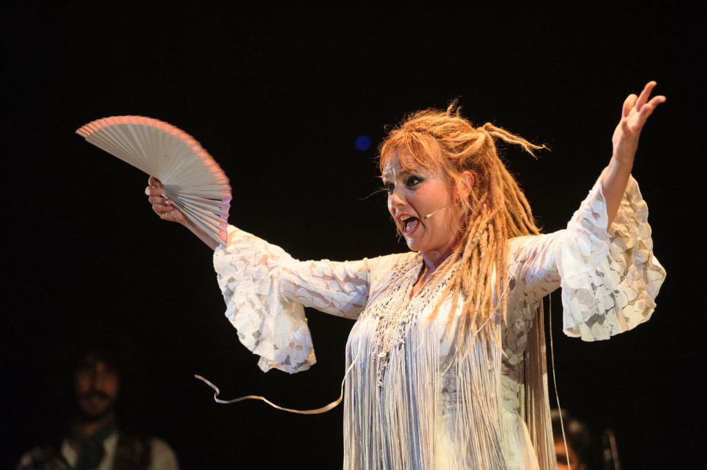 De la mano de la artista gaditana Naike Ponce, directora y partícipe de este espectáculo,“Mujeres celebran a Paco de Lucía” nos muestra el otro lado del maestro y la relación genuina con las mujeres en su vida. (La sanluqueña Naike Ponce. Foto del I Festival Flamenco de Andorra)