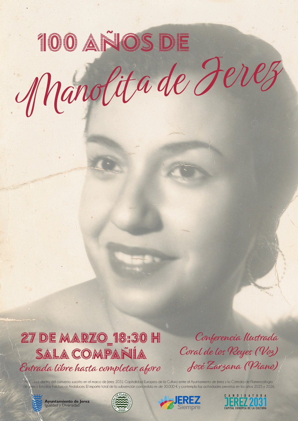 La Cátedra de Flamencología y Estudios Folclóricos Andaluces de Jerez y el Ayuntamiento de Jerez, a través de la delegación de Igualdad, recuerda este jueves 27 de marzo a partir de las 18.30 horas en la Sala Compañía, y con entrada libre hasta completar aforo, la figura de Manolita de Jerez.