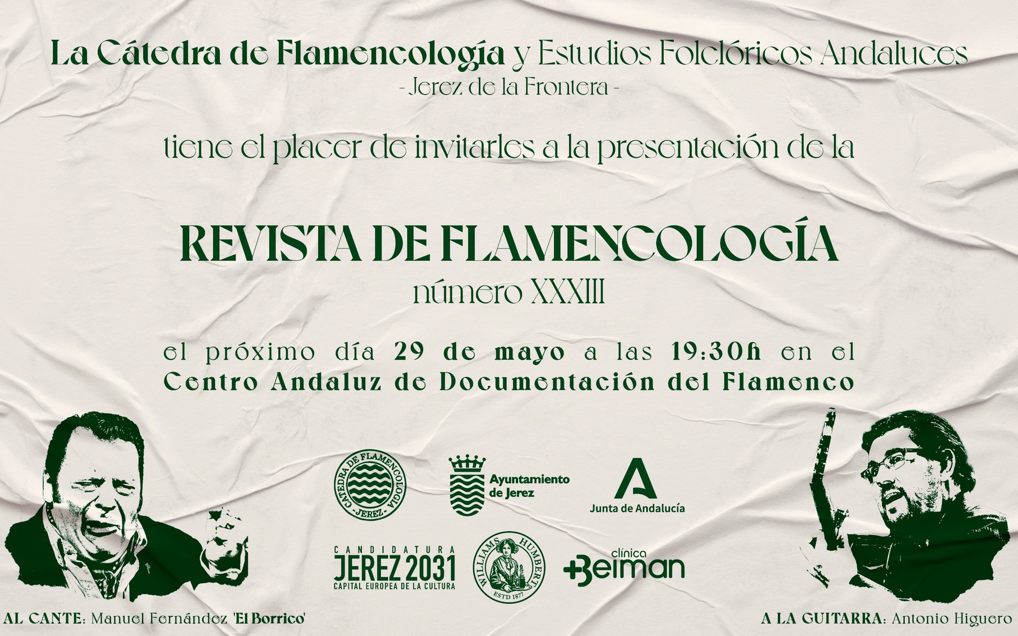 Dice así la comunicación desde la institución jerezana: el próximo jueves 29 de mayo, a las 19.30 horas y en el Centro Andaluz de Documentación del Flamenco (Plaza Pemartín, 1) presentamos una nueva edición de nuestra revista «Flamencología’. El acto contará con un recital con el cante de Manuel Fernández «Borrico’ y la guitarra de Antonio Higuero. Gracias a nuestros patrocinadores y colaboradores.